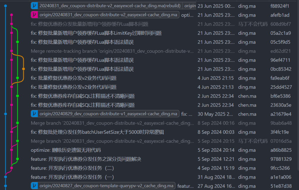 花开富贵 回复 浮语虚辞:batchSaveUserCouponList方法也很有考究,直接执行userCouponMapper.insert(userCouponDOList, userCouponDOList.size())方法进行批量插入 如果批量插入有错,那就通过一条一条插入执行,所以遍历userCouponDOList来进行插入。如果单挑插入也失败的话,那就执行hasUserReceivedCoupon看用户是否领取过优惠券 如果已经领取过了,那就让该条记录的行号以及对应错误原因也就是用户已领取该优惠券加入到List<CouponTaskFailDO> couponTaskFailDOList中,最后批量插入数据库 因为用户已经领取过了,那就添加到List<UserCouponDO> toRemove表示已经处理过了,之后要在List<UserCouponDO> userCouponDOList集合中移除 所以执行完batchSaveUserCouponList方法之后,此时userCouponDOList已经剔除了重复的或者已经添加的记录,然后将这些优惠券领取记录添加到缓存中, 因为数据库层面加入用户优惠券记录已经在上面做了,这里就是执行batch_user_coupon_list.lua脚本 再来看分发任务标识为true的情况 分发任务结束标识为true标识没有Excel记录了,说明Excel数据读取结束,整个分发流程走到了最后阶段,需要处理剩下的缓冲队列中没有发出去的用户数据 首先获取这个批次的数据数量,然后赋值给event 然后执行decrementCouponTemplateStockAndSaveUserCouponList方法进行分发,过程不在赘述,和上面一样,最后就是让分发优惠券成功的数据给存入用户优惠券表中 然后再从缓冲队列里面pop出Integer.MAX_VALUE个数据,也就是全部pop出去,这些就是不能够正确处理的,也就是库存不足或者用户已经领取优惠券的原因, 而执行batchSaveUserCouponList的时候已经让用户领取优惠券的情况给考虑进去了,所以这里的原因就是库存不足,然后让领取失败的记录给批量存入数据库中 执行到最后,让该分发任务状态改为已完成,并且更新相应字段即可