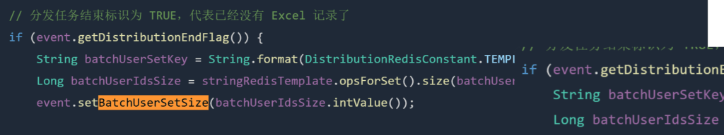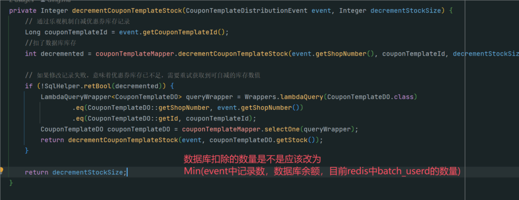 假如excel一共有6000条数据,扫描到5000的时候发送消息到消息队列,然后一直执行到6000,这中间的假如消费者还没开始进行消费,中间会连续产生1000条消息到消费者 他们的event要消耗的库存分别是5000,5001,5002,。。。6000以及doAfter产生的6000[这里的distributionEndFlag是true]。 然后开始消费, 第一条消息(5000)正常扣库存5000,5001...5999,6000都会因为if (event.getDistributionEndFlag()) 和event.getBatchUserSetSize() % BATCH_USER_COUPON_SIZE == 0被剔除,但是由于doAfter产生的6000的endFlag是True,所以他会通过第二图的代码,由于Integer couponTemplateStock = decrementCouponTemplateStock(event, event.getBatchUserSetSize());因为这个返回的couponTemplateStock=Min(event中要消耗的数量=6000,数据库余额) ,在这一步 会消耗大量的数据库库存吗?