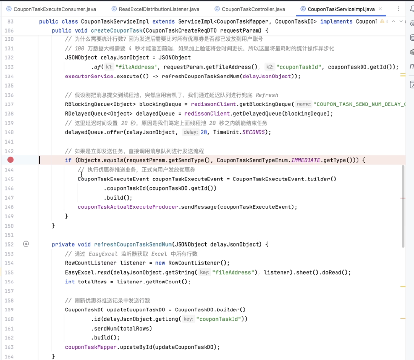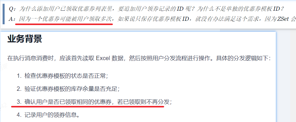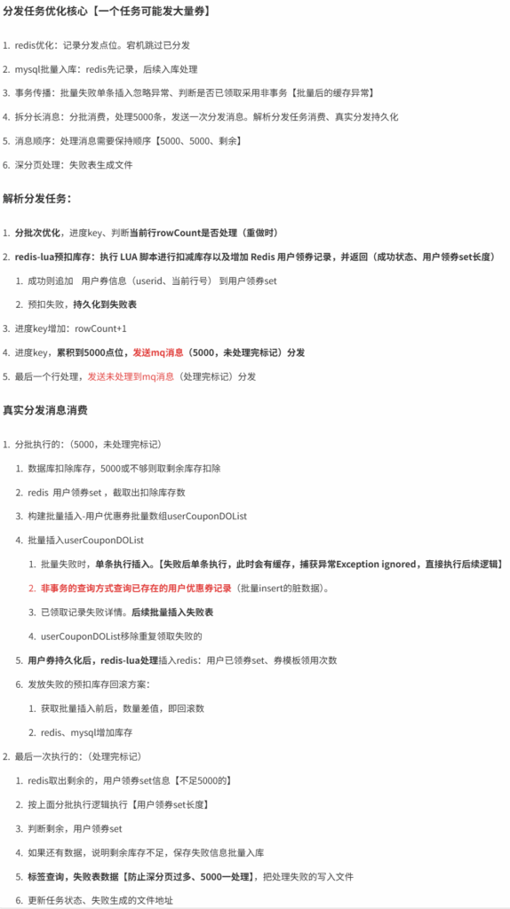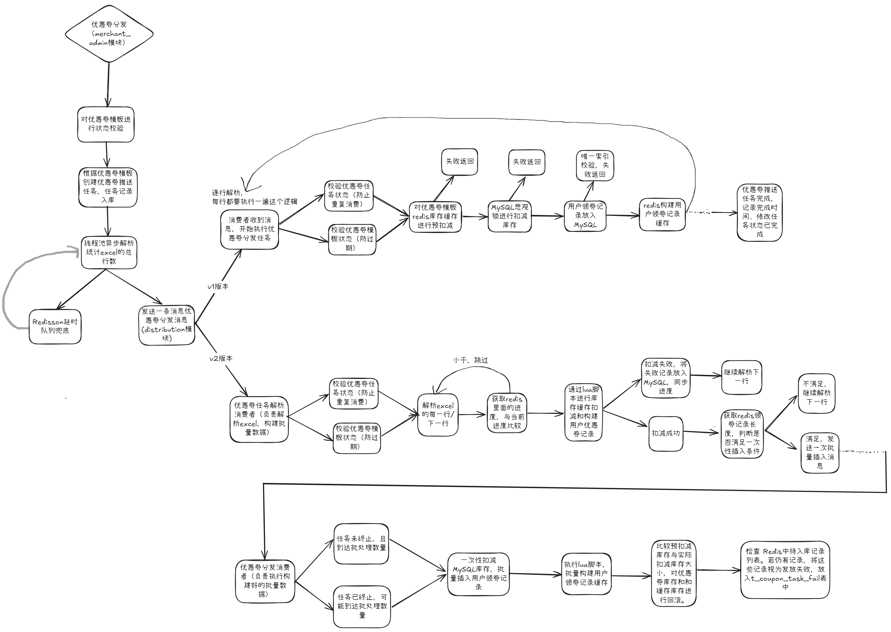 分享一下自己梳理的逻辑 首先看admin后管中的执行流程 1.CouponTemplateServiceImpl类 执行createCouponTemplate方法创建了优惠券,然后让该优惠券信息存入数据库 2.CouponTaskServiceImpl类 执行createCouponTask方法创建优惠券分发任务,然后让该优惠券分发任务存入数据库 这个任务是分发指定的优惠券给Excel中的用户,统计Excel中的行数是通过线程池异步执行的。 如果分发任务是立即发送,那状态就是执行中,如果不是立即发送,也就是定时发送,那状态就是待执行 如果是立即发送,就通过mq发送该分发任务id 再来看distribution分发的流程,注意我们分发的时候,是分发指定的优惠券给Excel中的用户 也就是优惠券id在这个流程中是确定的 1.CouponTaskExecuteConsumer类 执行onMessage消费mq中的消息,获取分发任务id 然后根据id从数据库中查询该任务 判断任务状态是否是执行中,如果不是执行中,那就说明还不该执行 如果任务是执行中,那就判断优惠券状态是否正确,也就是看优惠券是生效还是结束 如果优惠券生效,那就开始执行优惠券推送任务/分发任务