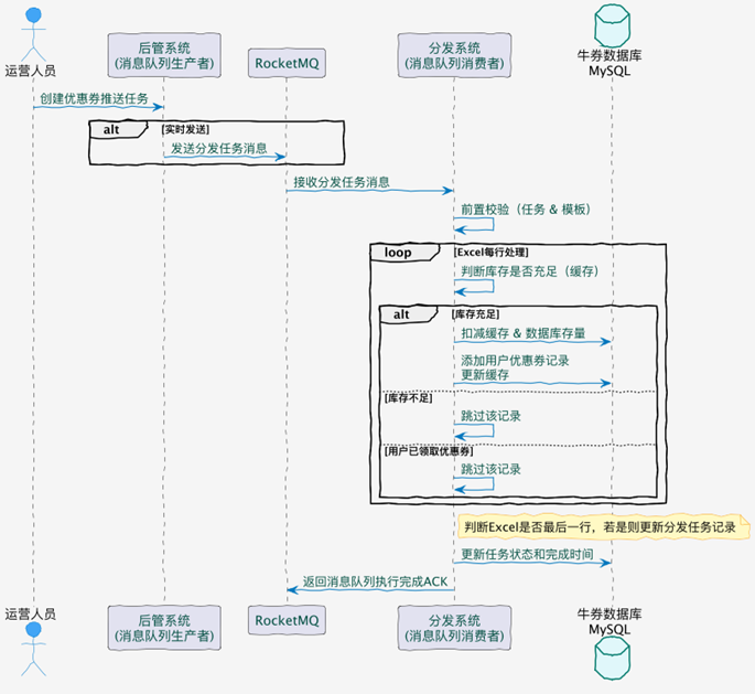 看了两三遍算是看懂了,整个执行流程大概是这样 : (1)->(上一章的内容)后管服务创建分发任务表插入到数据库 -> 统计excel行数 -> 将行数插入优惠券分发任务表 ->发送定时消息或延时消息执行给分发引擎服务执行分发任务。 (2) -> 校验消费者拿到消息并进行校验 -> 使用easyexal读取 -> Easyexcel监听类 记录执行点位 、执行缓存扣减,记录批量数据到缓存 -> 批量达到5000,发送消息给分发消费者 -> 分发消费者拿到消息(顺序执行) -> 批量保存到数据库 ->要是库存不足,批量记录到发放失败表 -> 更新分发任务表的完成时间