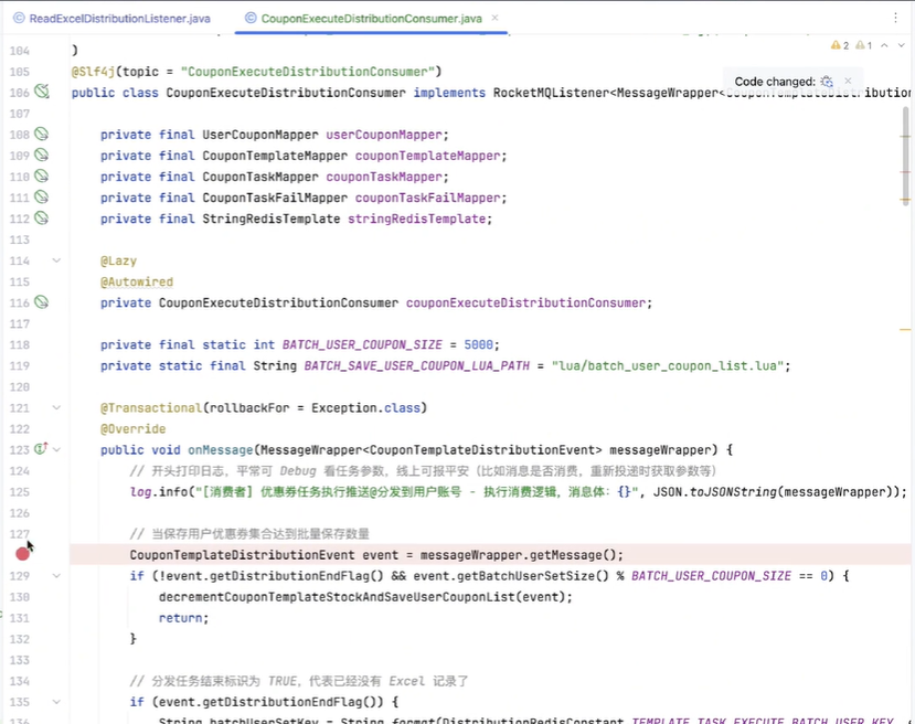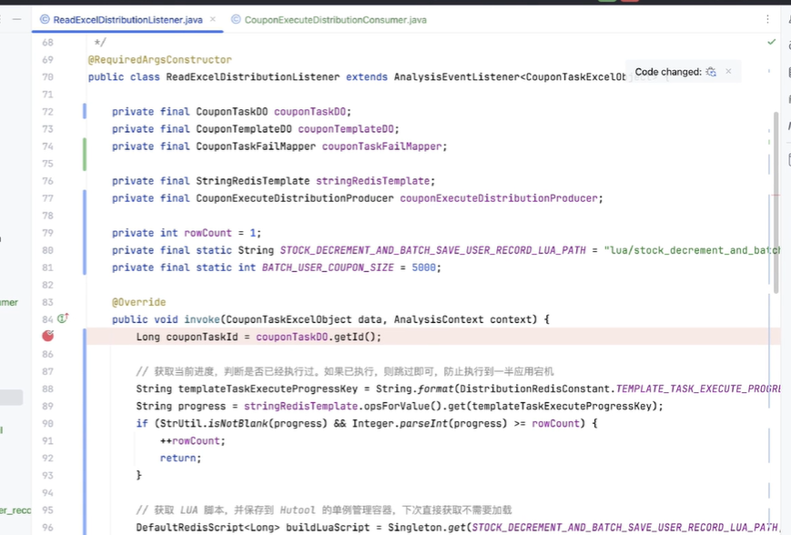 代码主要分为ExcelDistributionListener(读取excel每一行数据,做一些前置工作)和CouponDispenseConsumer(真正执行分发)