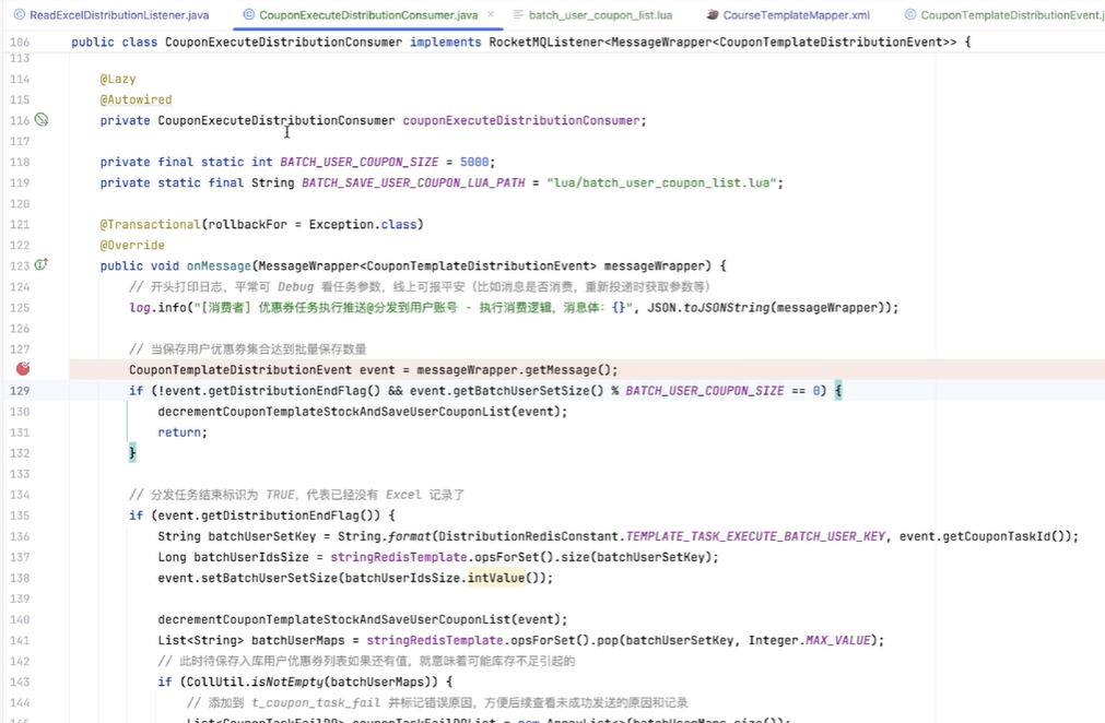 花开富贵 回复 浮语虚辞:3.CouponExecuteDistributionConsumer类 该消费者就是用来消费ReadExcelDistributionListener类发送的消息的,直接看onMessage方法即可 首先获取消息,然后看消息中分发任务标识是否为false 先来看分发任务标识为false的情况 如果为false并且消息中批次大小%BATCH_USER_COUPON_SIZE==0,那就表示后续还有数据没处理,并且当前缓存了一个批次的用户数据了,所以直接先处理这个批次的数据 然后直接执行decrementCouponTemplateStockAndSaveUserCouponList方法进行分发,这个方法才是真正干活的方法,传入的参数是CouponTemplateDistributionEvent event 该方法首先执行decrementCouponTemplateStock进行库存的扣减,传入的参数是CouponTemplateDistributionEvent event以及event中的批次大小 decrementCouponTemplateStock方法通过乐观锁机制来进行库存的扣减,扣减失败就从数据库中查询最新的库存,然后递归调用自身用当前库存数量重新扣减,递归的目的是为了缩小扣减数量,直到库存扣减或库存为0 decrementCouponTemplateStock方法最终返回的是实际扣减的数量,然后赋值给couponTemplateStock 如果couponTemplateStock小于等于0,表示库存不够了,那就decrementCouponTemplateStockAndSaveUserCouponList方法直接return退出不干活 如果couponTemplateStock大于0,表示扣减成功了couponTemplateStock个(可能并不是都扣减成功了) 那就从缓冲队列里面pop出couponTemplateStock个数据,赋值给List<String> batchUserMaps,因为couponTemplateStock个肯定都是扣减成功的,所以可以放心处理 处理的方式就是,遍历这个集合,然后转回map(因为存入的时候就是存储userId以及在excel中对应行数rowNum的转为json的map) 然后让对应的行号、用户id、优惠券id、领取数量也就是1等信息构建为UserCouponDO类然后存入List<UserCouponDO> userCouponDOList集合中,最后批量插入用户优惠券表中(也就是执行batchSaveUserCouponList方法),这就表示领取成功了