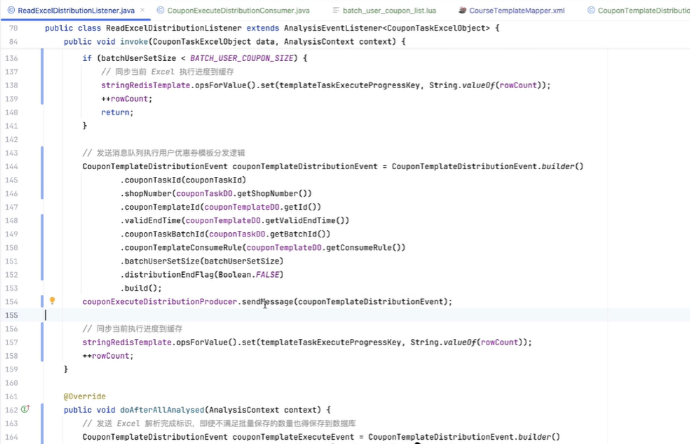 @RequiredArgsConstructor public class ExcelDistributionListener extends AnalysisEventListener<CouponDistributionUserExcelBO> { private final CouponTemplateDO couponTemplateDO; private final RedisProxy redisProxy; private final CouponDistributionFailMapper couponDistributionFailMapper; private final CouponDistributionTaskDO taskDO; private final CouponDispenseProducer couponDispenseProducer; /** * 跳过标题,从第2行开始读excel */ private long rowRecord = 2; /** * 分批次执行的大小 */ private static final int BATCH_SIZE = 200; /** * 分发失败记录的暂存区 */ private final List<CouponDistributionTaskFailDO> failRecordCacheList = new ArrayList<>(BATCH_SIZE); @Override public void invoke(CouponDistributionUserExcelBO excelData, AnalysisContext context) { String couponTemplateKey = StrUtil.join(":", "coupon-template", couponTemplateDO.getId()); String processKey = StrUtil.join(":", "coupon-distribution-process", taskDO.getId()); if (redisProxy.exist(couponTemplateKey)) { // 获取当前执行进度,优化因系统重启或宕机而重复执行分发 String point = redisProxy.get(processKey, String.class); if (point != null && Integer.parseInt(point) >= rowRecord) { rowRecord++; return; } // 获取lua脚本对象并保存到单例容器,优化每次都需要重新创建脚本对象 DefaultRedisScript<Long> luaScript = Singleton.get(AdminConstantPool.COUPON_DISTRIBUTION_TASK_LUA_SCRIPT, () -> { DefaultRedisScript<Long> script = new DefaultRedisScript<>(); script.setScriptSource(new ResourceScriptSource(new ClassPathResource(AdminConstantPool.COUPON_DISTRIBUTION_TASK_LUA_SCRIPT))); script.setResultType(Long.class); return script; }); String batchUserReceiveCouponKey = StrUtil.join(":", "user-coupon-collection", taskDO.getId()); String userId = excelData.getUserId(); Map<Object, Object> userRowNumMap = Collections.emptyMap(); // 计算用户领券集合缓存分片键并判断当前用户是否已经领过该优惠券 int mod = (Long.valueOf(userId).hashCode() & Integer.MAX_VALUE) % 5; String key = StrUtil.join(":", "user-gained-coupon", mod); String hashKey = StrUtil.join("-", userId, couponTemplateDO.getId()); // 如果已领取过则将其保存为发券失败的记录 if (redisProxy.getTemplateInstance().opsForHash().hasKey(key, hashKey)) { Map<Object, Object> contentMap = MapUtil.builder() .put("userId", userId) .put("cause", "用户已领取过该优惠券") .build(); CouponDistributionTaskFailDO taskFailDO = CouponDistributionTaskFailDO.builder() .batchId(taskDO.getBatchId()) .content(JSONUtil.toJsonStr(contentMap)) .build(); failRecordCacheList.add(taskFailDO); } else { userRowNumMap = Collections.singletonMap("userId", userId); } if (userRowNumMap.isEmpty()) { // 检查一下失败记录暂存区的大小,及时进行批处理,防止在极端情况下堆积大量失败记录导致ArrayList扩容 if (failRecordCacheList.size() % BATCH_SIZE == 0) { couponDistributionFailMapper.insert(failRecordCacheList); failRecordCacheList.clear(); } return; } // 扣减缓存中的优惠券库存以及新增记录到用户领券集合 Long combineInt = redisProxy.getTemplateInstance().execute(luaScript, Arrays.asList(couponTemplateKey, batchUserReceiveCouponKey), JSONUtil.toJsonStr(userRowNumMap)); assert combineInt != null; boolean hasInventory = BinarySplitUtil.extractFirstField(combineInt); if (!hasInventory) { failRecord(processKey, userId, "缓存中优惠券库存不足"); return; } int setSize = BinarySplitUtil.extractSecondField(combineInt); if (setSize < BATCH_SIZE) { syncProcess(processKey); return; } // 通知另一个消费者执行分发,避免单条消息消费时间过长,这里取模可以保证每5000为一个批次的发消息,最后不足5000的交给后置逻辑来处理 if (setSize % BATCH_SIZE == 0) { CouponDispenseMessage messageEvent = CouponDispenseMessage.builder() .taskId(taskDO.getId()) .shopId(couponTemplateDO.getShopId()) .couponTemplateId(couponTemplateDO.getId()) .taskBatchId(taskDO.getBatchId()) .batchSetSize(BATCH_SIZE) .endFlag(false) .build(); couponDispenseProducer.sendOrderlyMessage(messageEvent); } syncProcess(processKey); } else { failRecord(processKey, null,"优惠券缓存失效"); } } @Override public void doAfterAllAnalysed(AnalysisContext context) { CouponDispenseMessage messageEvent = CouponDispenseMessage.builder() .taskId(taskDO.getId()) .shopId(couponTemplateDO.getShopId()) .couponTemplateId(couponTemplateDO.getId()) .taskBatchId(taskDO.getBatchId()) .endFlag(true) .build(); couponDispenseProducer.sendOrderlyMessage(messageEvent); if (!failRecordCacheList.isEmpty()) { couponDistributionFailMapper.insert(failRecordCacheList); failRecordCacheList.clear(); } } /** * 保存分发失败的记录 * @describe 批量执行最保险的方法应该是发mq,但正常执行几乎不可能会分发失败 */ private void failRecord(String processKey, String userId, String cause) { Map<Object, Object> contentMap = MapUtil.builder() .put("userId", userId) .put("cause", cause) .build(); CouponDistributionTaskFailDO couponDistributionTaskFailDO = CouponDistributionTaskFailDO.builder() .batchId(taskDO.getBatchId()) .content(JSONUtil.toJsonStr(contentMap)) .build(); failRecordCacheList.add(couponDistributionTaskFailDO); if (failRecordCacheList.size() % 100 == 0) { couponDistributionFailMapper.insert(failRecordCacheList); failRecordCacheList.clear(); } syncProcess(processKey); } /** * 同步执行进度到缓存 */ private void syncProcess(String processKey) { redisProxy.set(processKey, String.valueOf(rowRecord)); rowRecord++; }