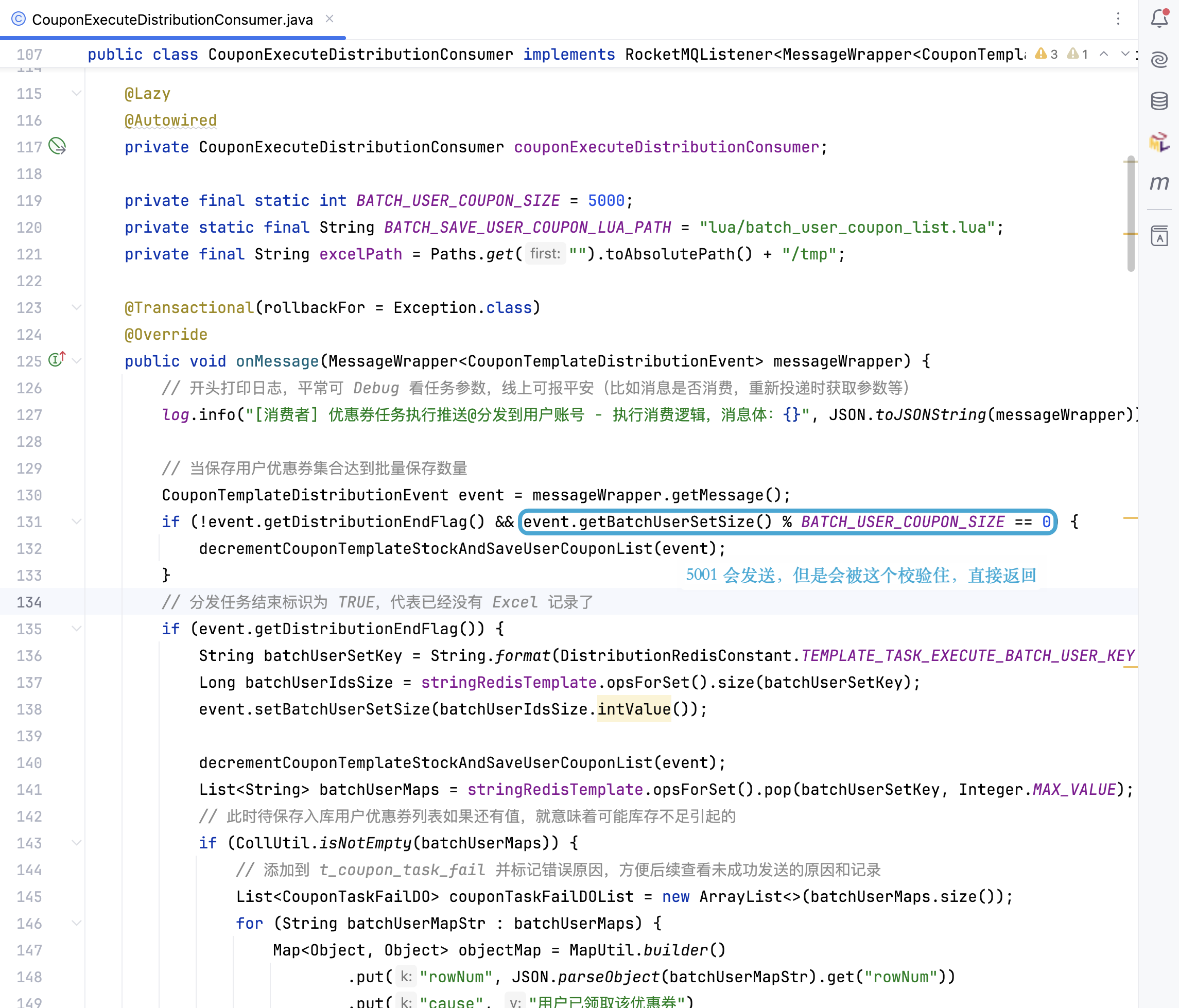 因为触发批次条数后,开始往 CouponExecuteDistributionConsumer 发送消息,但是有可能在执行消费前,Excel 监听器又往 Redis Set 结构添加了一条用户领券记录,所以就会出现比预期的结果多出几条的可能。这个并不会影响系统运行,忽略就好。