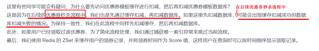执行时数据库宕机,那么就会面临事务回滚问题,意味着我们需要将从 Redis 中获取的领券用户记录再保存到 Redis。 - 批量新增时有部分用户优惠券已存在,那么新增数量和预期就会不一致,也就意味着我们需要将这些失败的库存返回给数据库和缓存。
