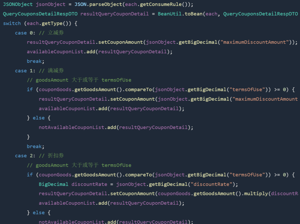 notAvailableCouponList.add(BeanUtil.toBean(each,QueryCouponsDetailRespDTO.class));}JSONObject jsonObject =JSON.parseObject(each.getConsumeRule());QueryCouponsDetailRespDTO resultQueryCouponDetail =BeanUtil.toBean(each,QueryCouponsDetailRespDTO.class);switch(each.getType()){case0:// 立减券