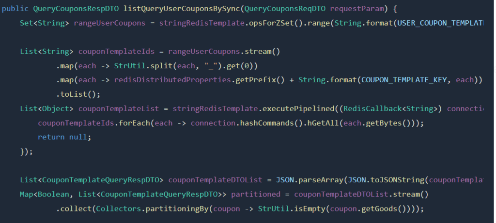List<String> couponTemplateIds = rangeUserCoupons.stream().map(each ->StrUtil.split(each,"_").get(0)).map(each -> redisDistributedProperties.getPrefix()+String.format(COUPON_TEMPLATE_KEY, each)).toList();List<Object> couponTemplateList = stringRedisTemplate.executePipelined((RedisCallback<String>) connection ->{