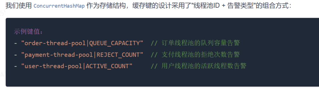 OneThread 的策略:在 Interval(例如 5 分钟)内,同一个线程池的同一种告警,只发一次。为每个"线程池ID + 告警类型"的组合维护一个时间戳记录;当新告警到达时,检查距离上次发送是否超过配置的时间间隔;如果超过间隔时间,允许发送并更新时间戳;否则拒绝发送