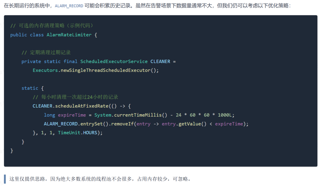 ScheduledExecutorService每小时清理一次过期 Key。ALARM_RECORD.entrySet().removeIf(entry -> entry.getValue() < expireTime);- 这是一个非常实用的补丁,生产环境级代码必须考虑数据的生命周期管理。