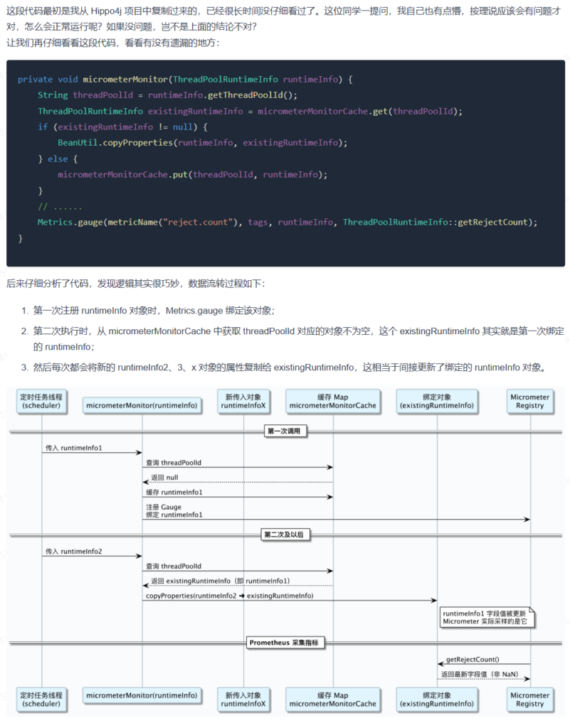 换句话说,第一次传入的runtimeInfo1被绑定后,之后无论你传入runtimeInfo2、3、4,Micrometer都会忽略,只会继续读取runtimeInfo1的字段值 。在之前的文章中,我们提到过如果没有缓存层会出现获取值 NaN 的情况,这正好对应了“即使你传入的是新对象,也会被忽略,仍然使用原始绑定的对象“。这意味着 metric 获取的绑定对象被 GC 回收了,可能就会返回 NaN。
