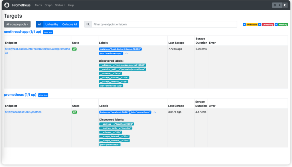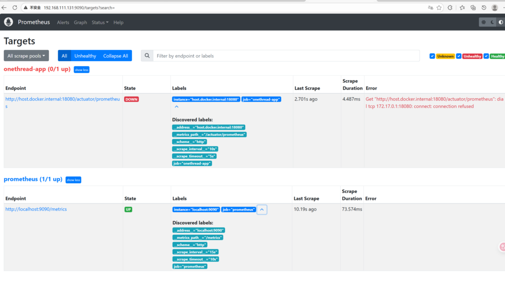 - job_name: 'onethread-app' # 任务名称,作为标签存储
