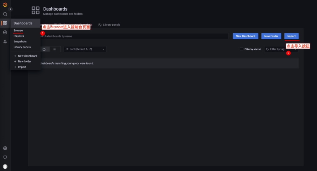 点击 Dashboard-Browse 按钮进入控制台页面,并点击 Import 按钮进行导入操作。