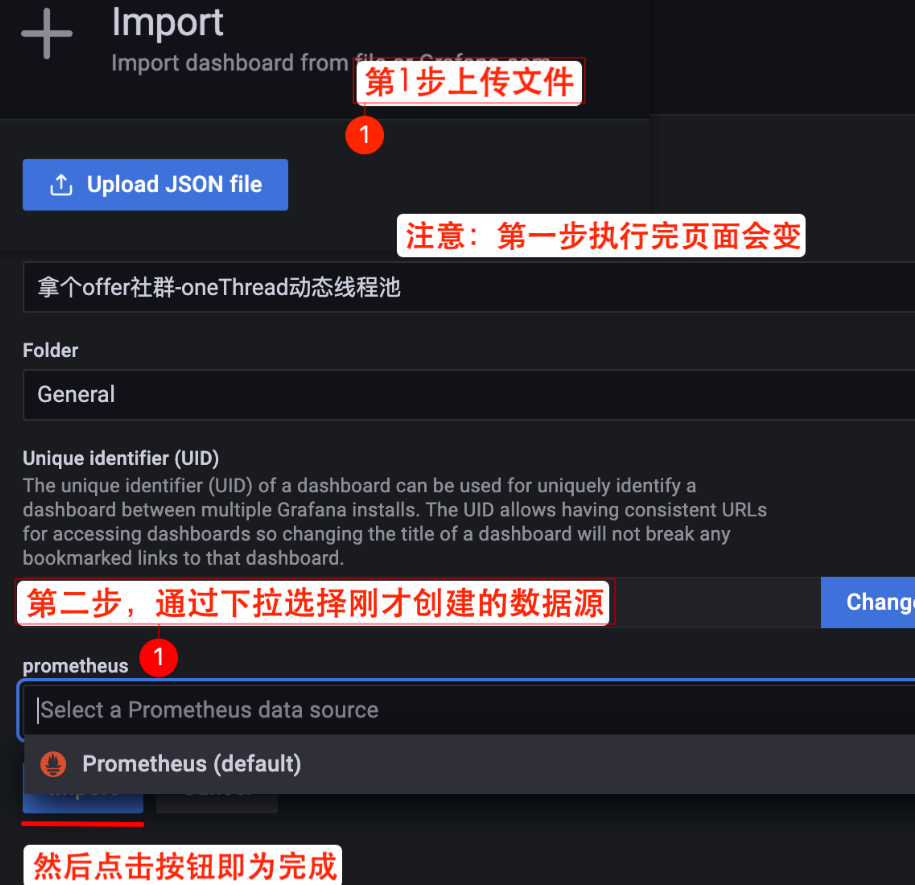 上传 JSON 文件并选择 Prometheus 数据源。