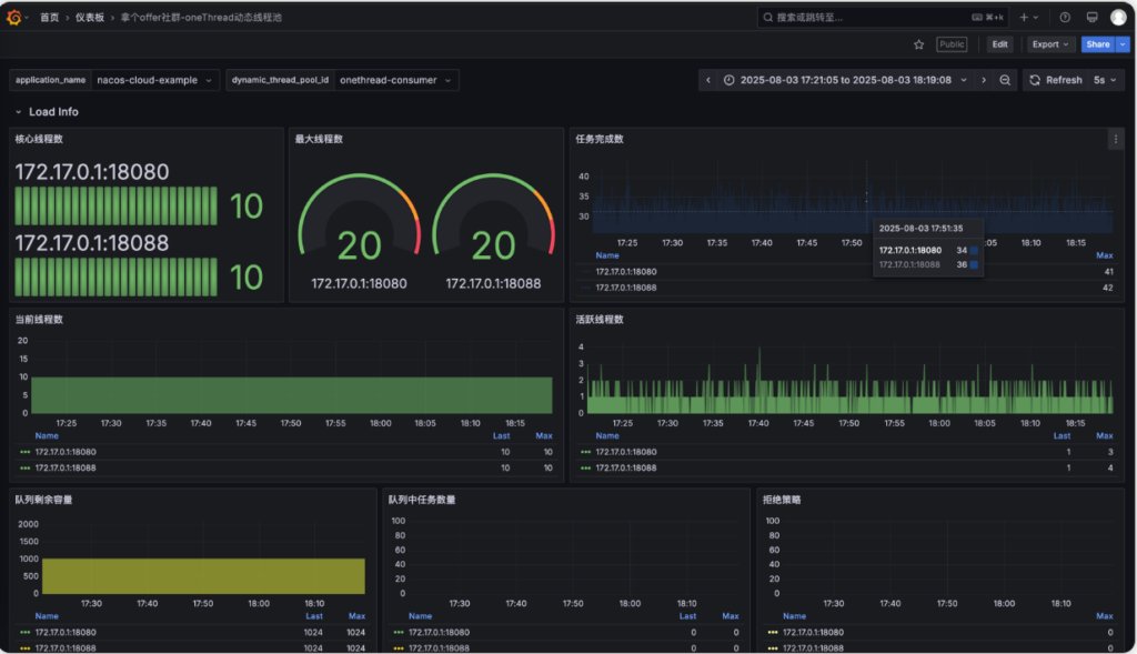 application_name和dynamic_thread_pool_id下拉框。 - 这利用了 Grafana 的变量功能,允许你在一套大屏里,通过切换下拉框来查看不同服务、不同线程池的数据,实现了复用。