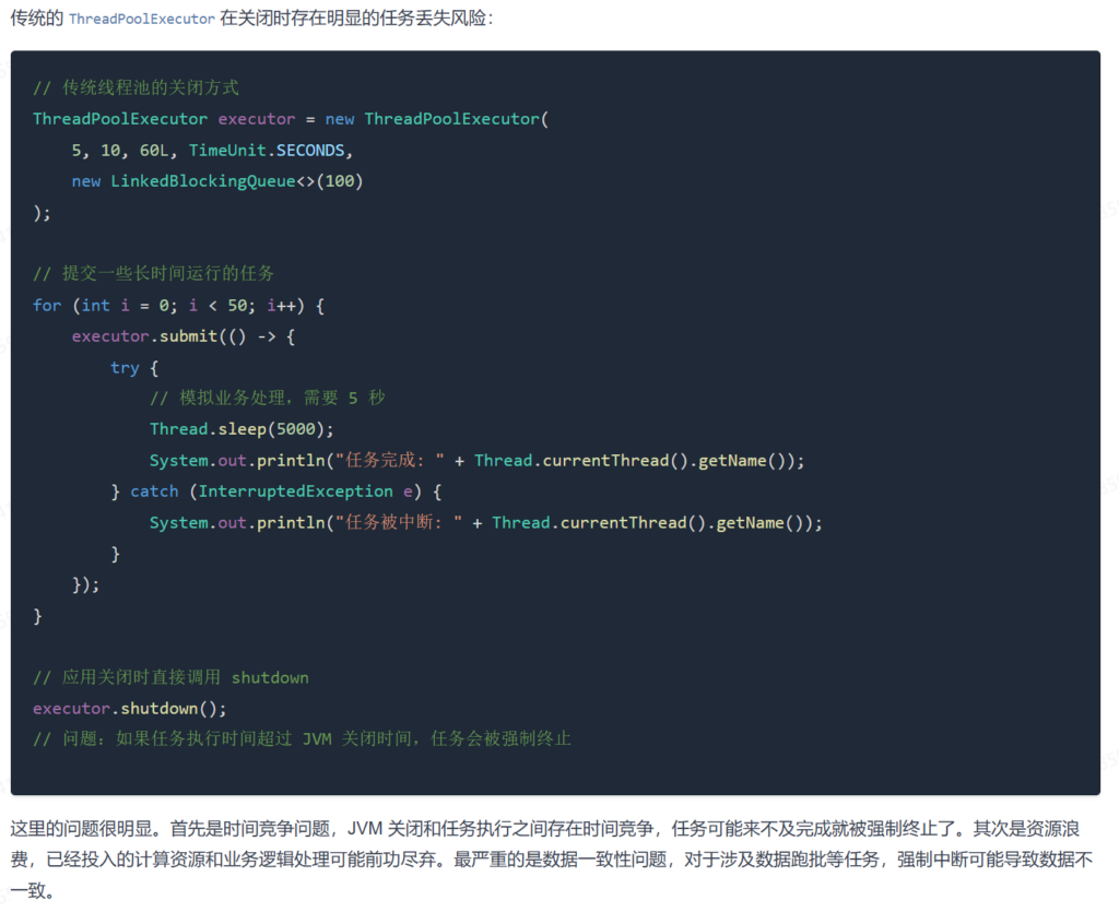 很多人对线程池的 shutdown() 方法有误解,认为调用了它,线程池就会乖乖把活干完再关。事实并非完全如此,尤其是在 Web 容器(如 Tomcat/Spring Boot)关闭的场景下。