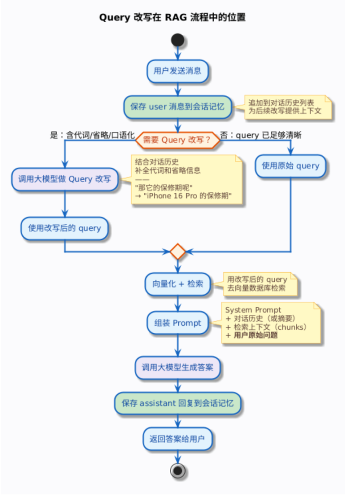 - 2.Query改写在会话记忆读取之后、检索之前 。这个位置很关键——改写需要对话历史作为输入,改写的结果用于检索