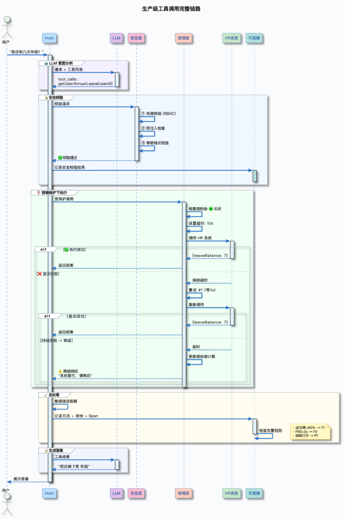 | 实现阶段 | 参数校验、超时控制、重试策略、降级方案、熔断机制 | 类型/格式/范围/权限校验;5~30 秒超时;指数退避重试;兜底信息/缓存数据;Resilience4j |